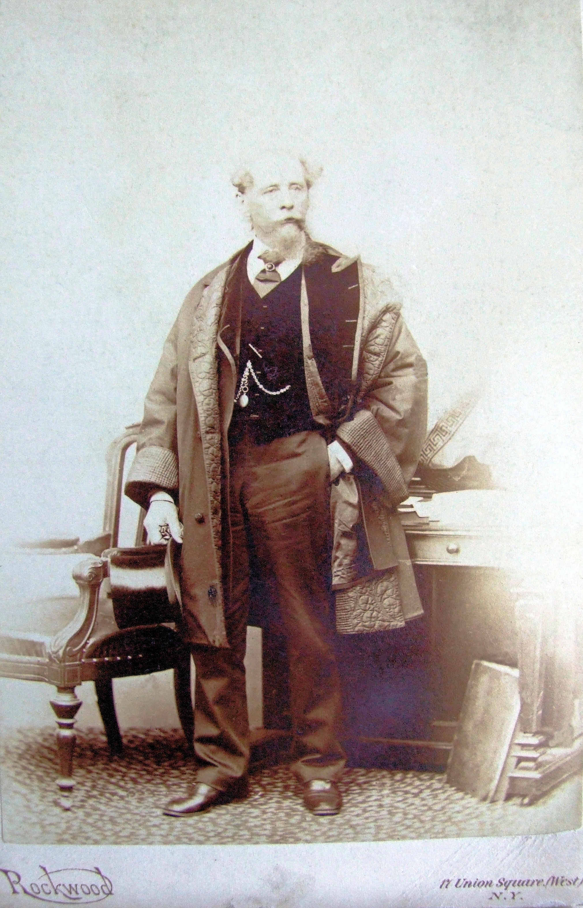 Ephemera; photograph of Charles Dickens; albumen print, cabinet card; picture taken circa 1867 by J Gurney & son (published by G G Rockwood); Dickens standing in quilted robe, holding top hat. Acquired and displayed at the museum in the early 20th century. Larger than the 'carte de visite' photograph cards, these images could be used for display in the home.