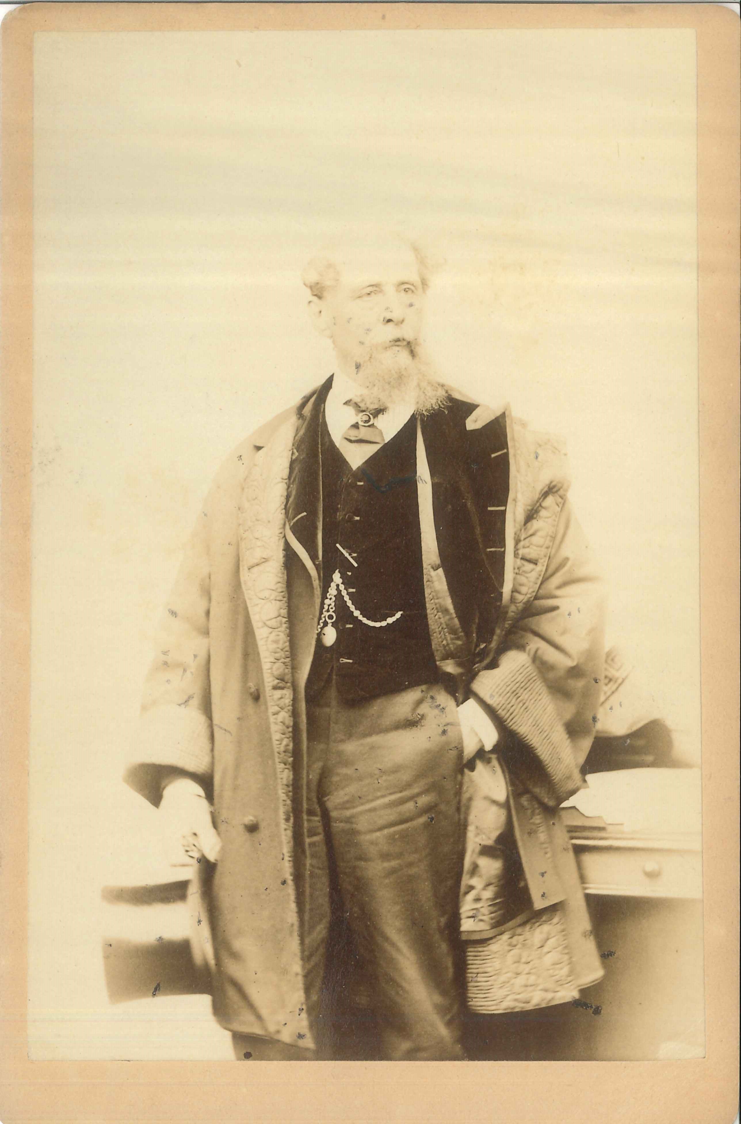 Ephemera; photograph of Charles Dickens; albumen print, cabinet card; picture taken circa 1867 by J Gurney & son (publisher unknown); Dickens standing in quilted robe, holding top hat (same shot as A7240). Acquired and displayed at the museum in the early 20th century. Larger than the 'carte de visite' photograph cards, these images could be used for display in the home.