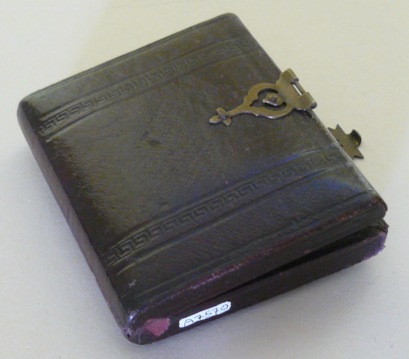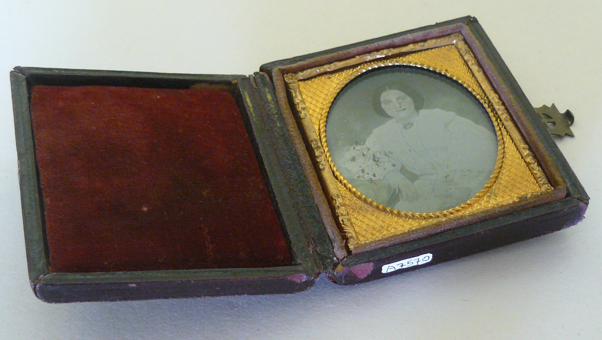 - DescriptionPhotograph (printed on glass) of a lady; in a tooled leather case with clasp; seated woman in a white dress, severe hair style with centre parting and large sleeves with undersleeves suggest c.1860?; case has glazing, red velvet lining; exterior of case has Greek key patterning. Horton collection.