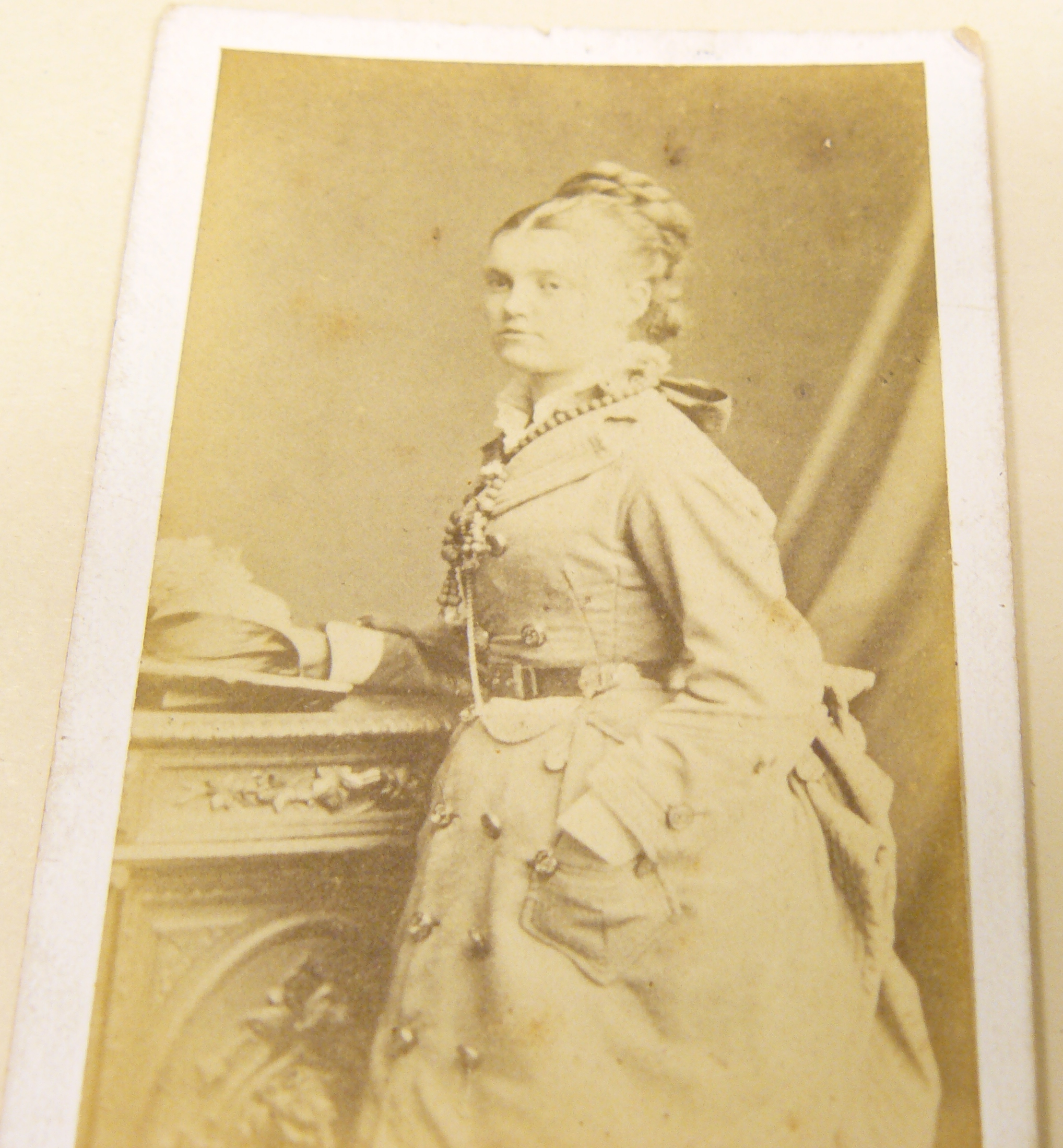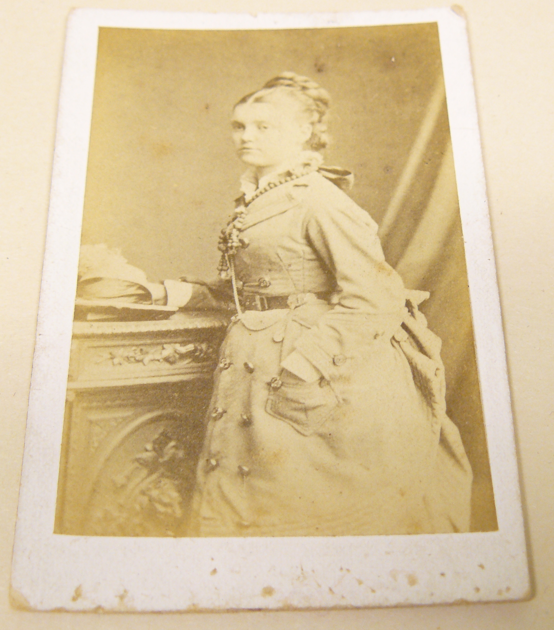 Ephemera; photograph of a young lady; albumen print, 'carte de visite' card; shows a young woman, standing with left hand in pocket, her right hand holding her hat which is placed on a cabinet. Horton collection.