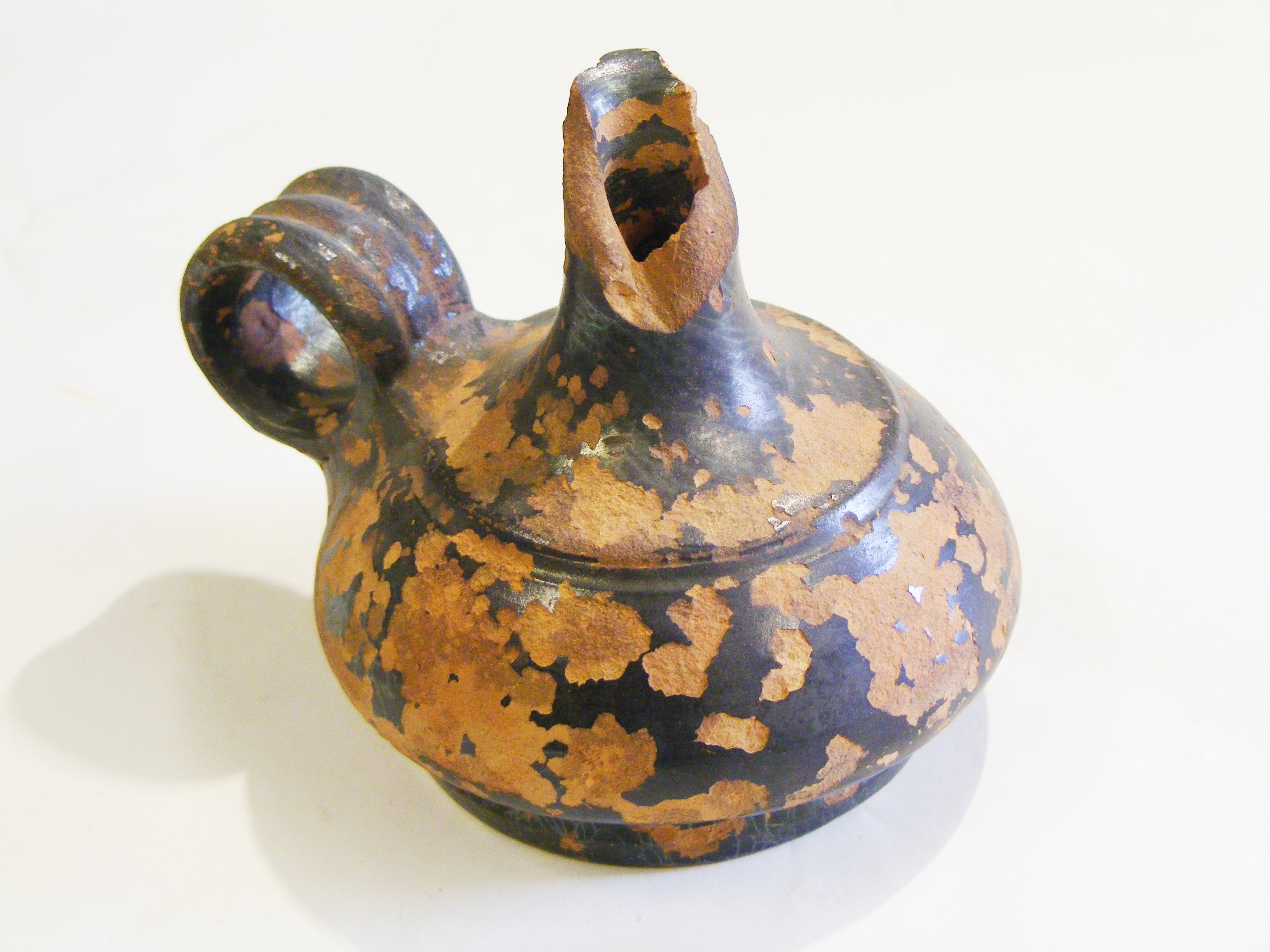 - DescriptionCeramic oil lamp or small jug; orange-brown fabric with gunmetal coloured glaze; flattened rounded body set on basal ring; narrow neck with the top broken away; simple loop handle; Greek or Roman.