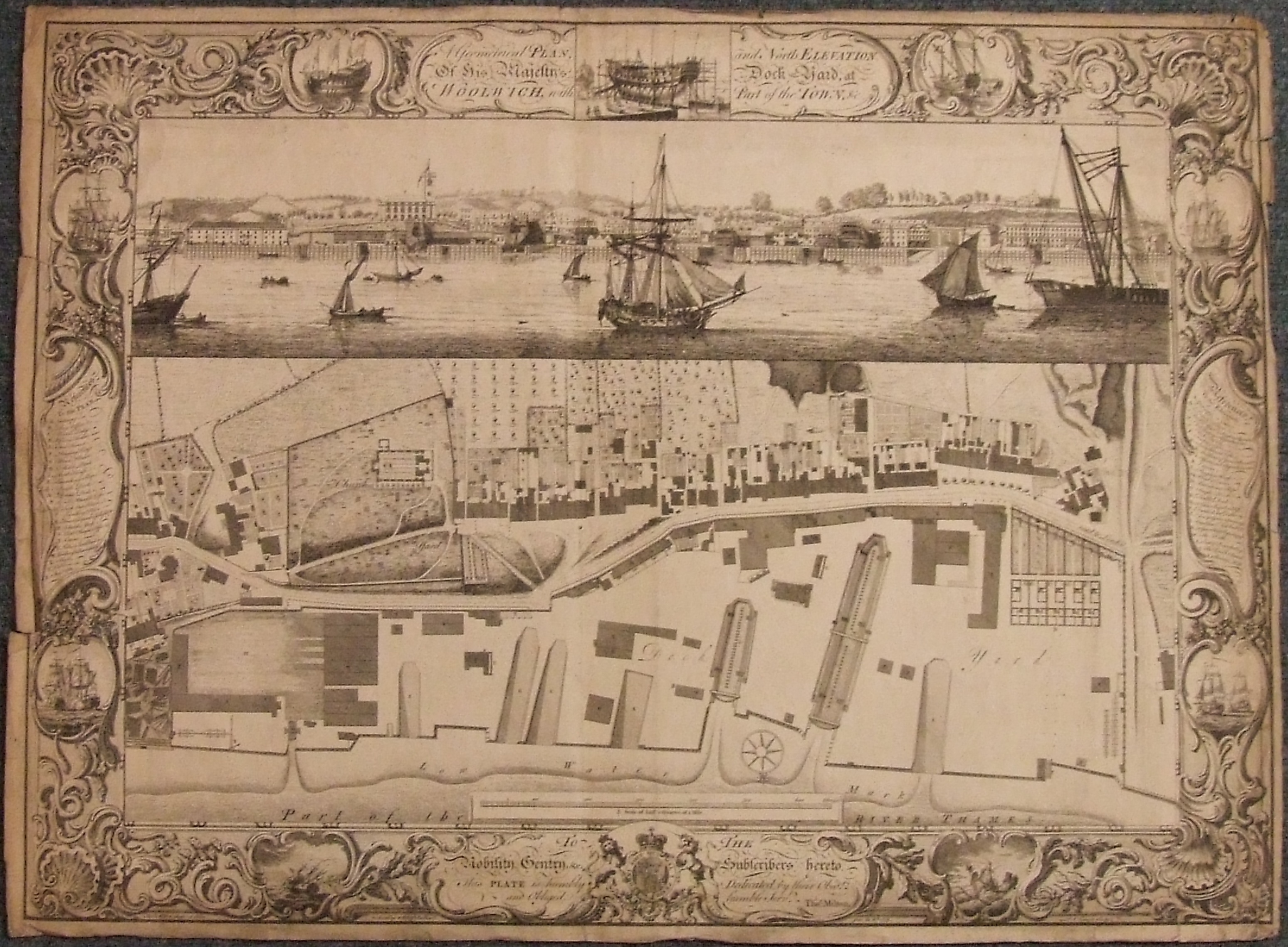 Engraving; plan & view of Woolwich Dockyard in 1753; plan with key for main buildings & features; header has view (north elevation) with ships, etc, also with a key for features. Two copies of this are in the museum collection - this one is actually marked 'E447', so don't know if the other (A5916) is also Harrison collection, or just a duplicate.