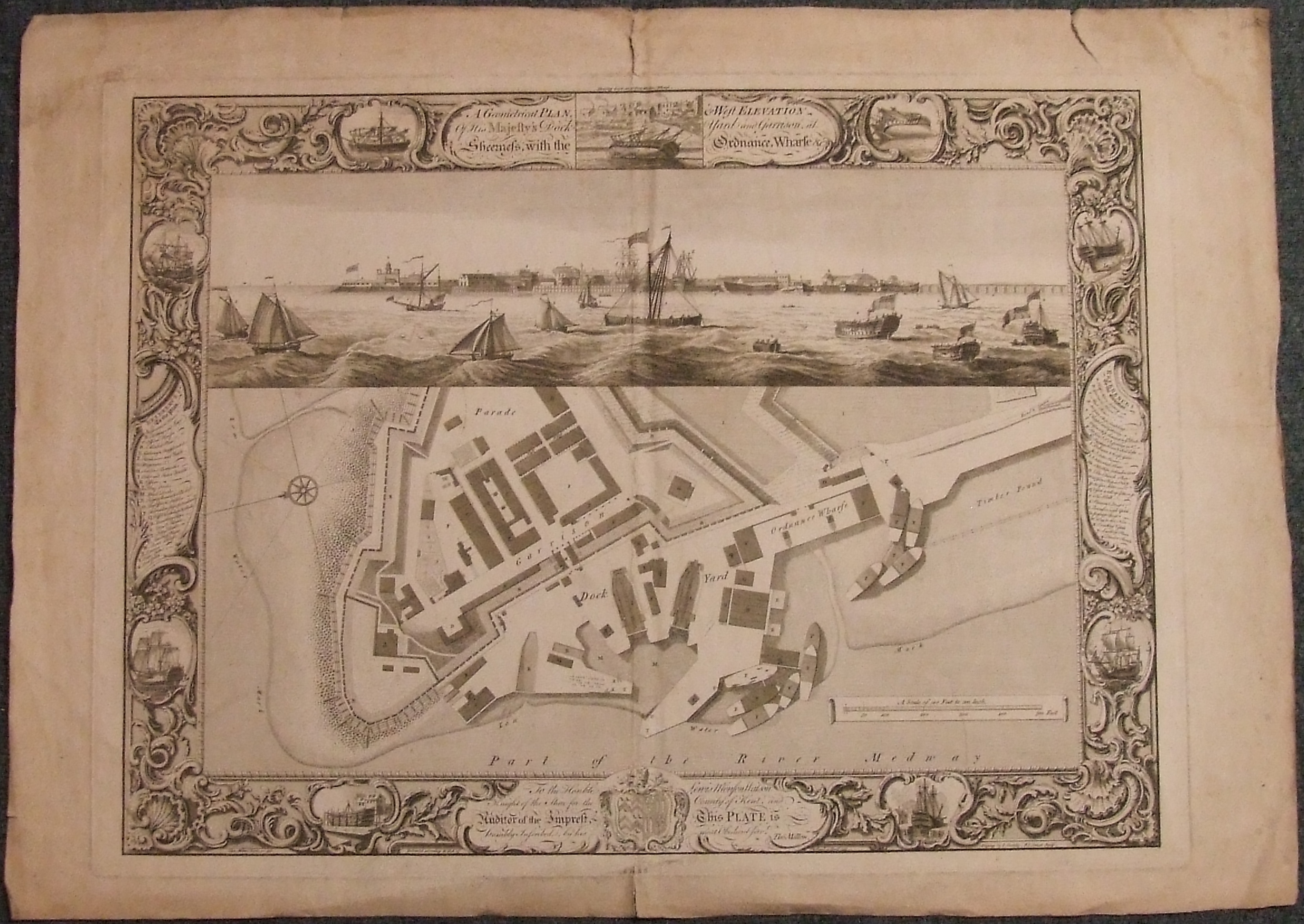 Engraving; plan & view of Sheerness Dockyard in 1755; plan with key for main buildings & features; header has view (west elevation) with ships, etc, also with a key for features. Mounted on card, previously on display at Eastgate house. Two copies of this are in the museum collection - this one is not actually marked 'E449', so may be just a duplicate.